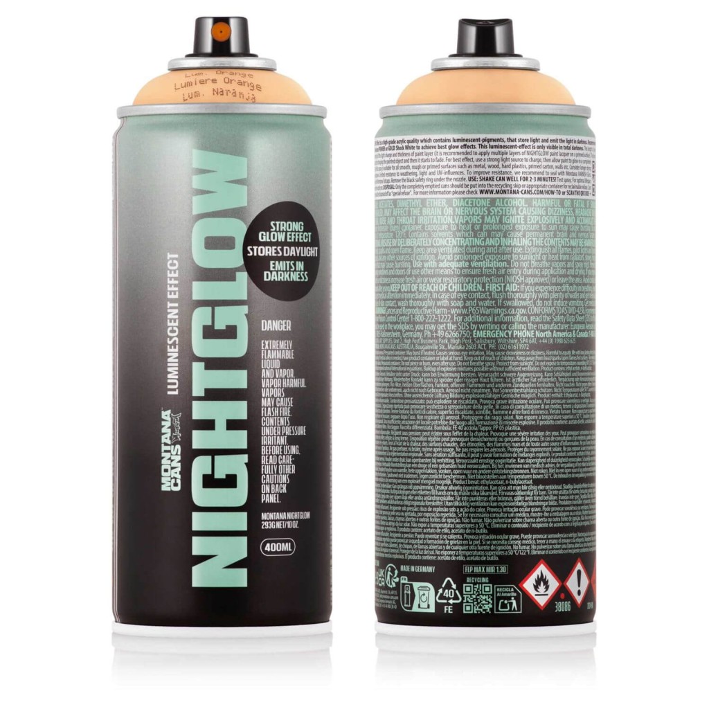Vylepšený sprej Montana NIGHTGLOW NG1000 je vysoce kvalitní vysokotlaká barva na nitro-akrylové bázi. Nové složení obsahuje ještě účinnější luminiscenční pigmenty, které dokážou efektivněji pohlcovat světelnou energii. Tuto nahromaděnou energii následně vyzařují v absolutní tmě, a vytváří tak okouzlující světelný efekt s výrazně delší výdrží.