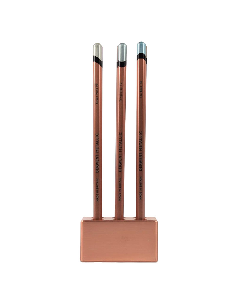 Sada obsahuje měděné těžítko a stojánek na pastelky v jednom.
