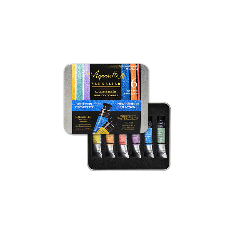 Kovová kazeta Iridiscentních extra-jemných akvarelů (6 tub, 10 ml) DECOUVERTE od Sennelier je vynikající volbou pro ty, kteří hledají vysoce kvalitní materiály pro svou uměleckou tvorbu. Akvarely Sennelier jsou formulovány s vyšším obsahem medu, který nejen zvýrazňuje jas a zářivost barev (brightness and luminosity), ale zároveň slouží jako konzervační látka, prodlužující životnost barev. Každý pigment je mlet na žulovém povrchu, což zaručuje extra-jemnou konzistenci ideální pro hladkou a precizní aplikaci.