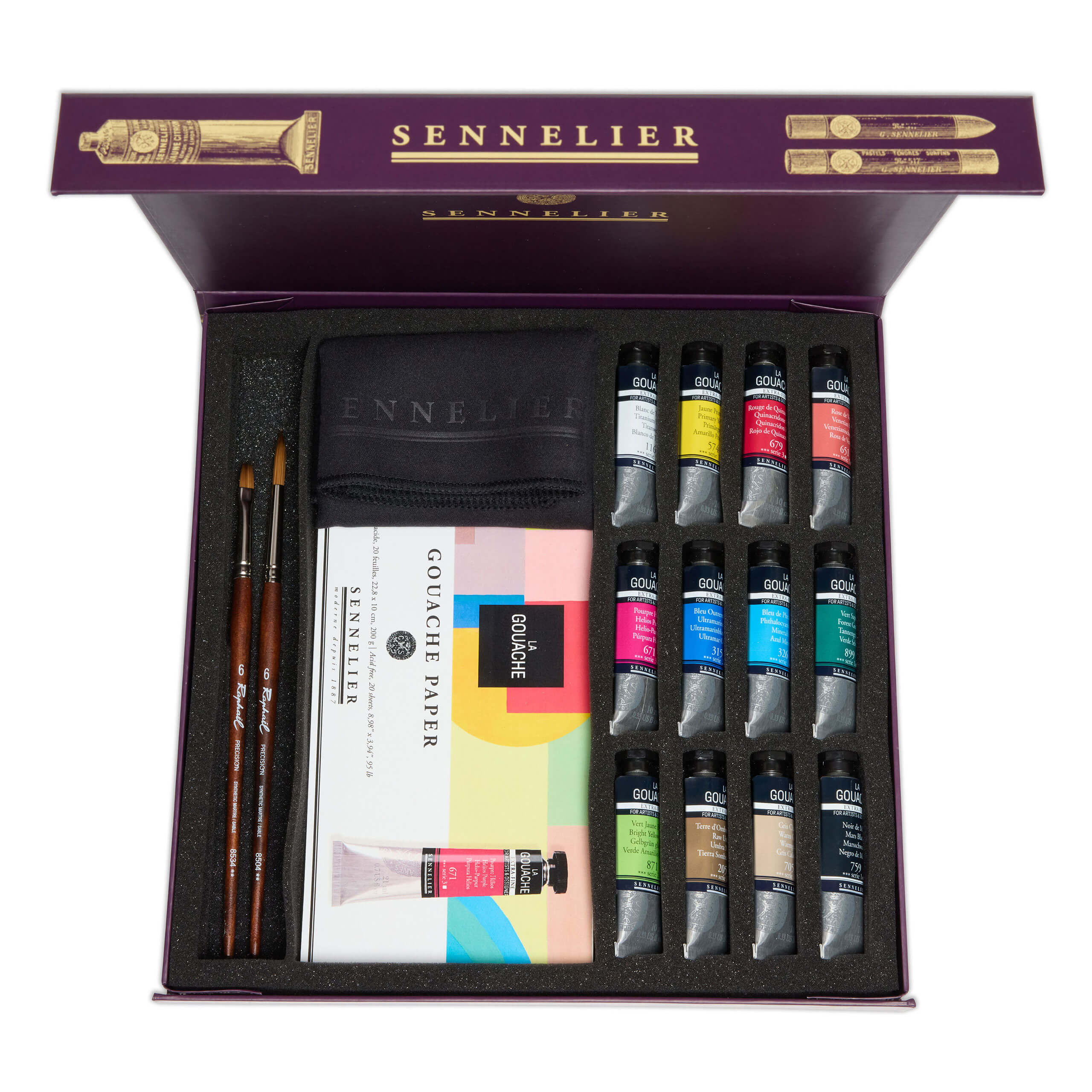 Mistrovské kvašové barvy v 10ml tubách. Vysoce pigmentované, vysoce stálobarevné, s matným povrchem. Hladká konzistence zajišťuje rovnoměrné krytí. Sada obsahuje základní barvy, které vám umožní vytvářet díla na jakékoli téma (portrét, krajina, zátiší). Sada navíc obsahuje akvarelový blok, dva štětce a hadřík s logem výrobce. To vše je dodáváno ve stylové kartonové krabičce s magnetickým zapínáním.