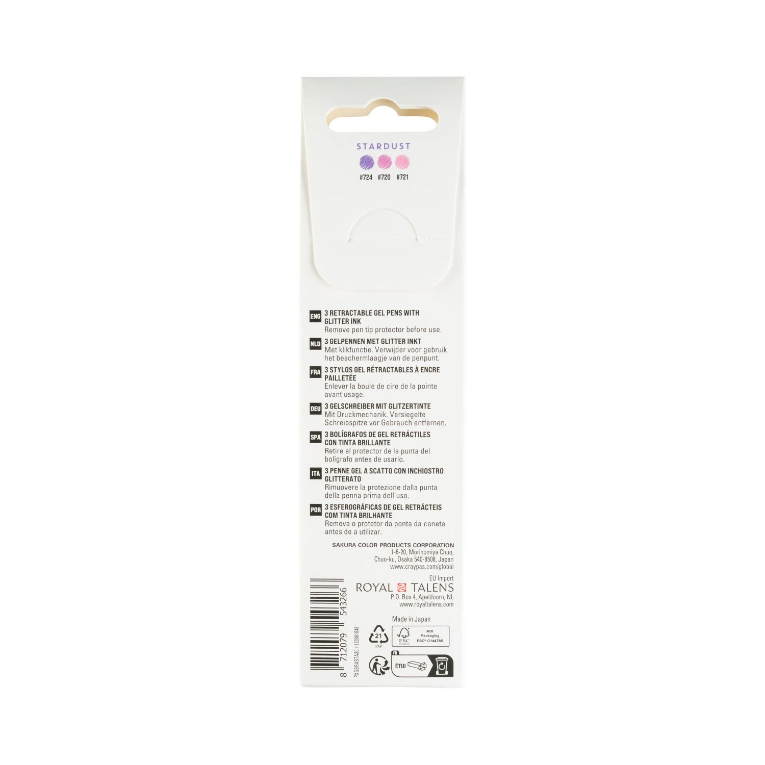 Tato sada obsahuje 3 zatahovací gelová pera s třpytivým inkoustem v barvách fialová, růžová, rose ("stardust").